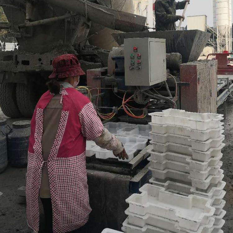 這種預制構件設備體積較小,可預制類型滿足大部分小型小尺寸預制構件設備的生產,湖北黃石客戶本次將設備直接布置在商品砼拌合站,罐車上料速度快,一天8小時可預制混凝土約40立方,滿足現場市政施工進度所需的水泥預制品的供給。